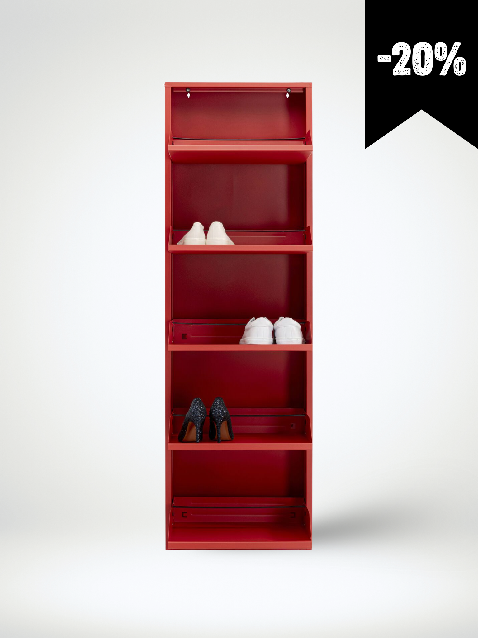 הדגם בנוי ממתכת איכותית ששומרת על איכות גבוהה למשך זמן רב, במבנה חכם שמנצל כל סנטימטר, שומר על סדר מוחלט בחלל ומציג את הנעליים בצורה נקייה ואסתטית. כל מגירה נפתחת בצורה חלקה, ומאפשרת גישה קלה ונוחה.